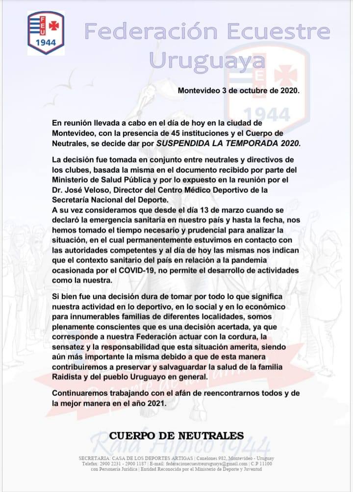 Tras una reunión entre neutrales, directivos de clubes y autoridades de la Secretaría Nacional de Deportes y el Ministerio de Salud Pública, se decidió suspender la temporada 2020 por parte de la Federación Ecuestre Uruguaya.