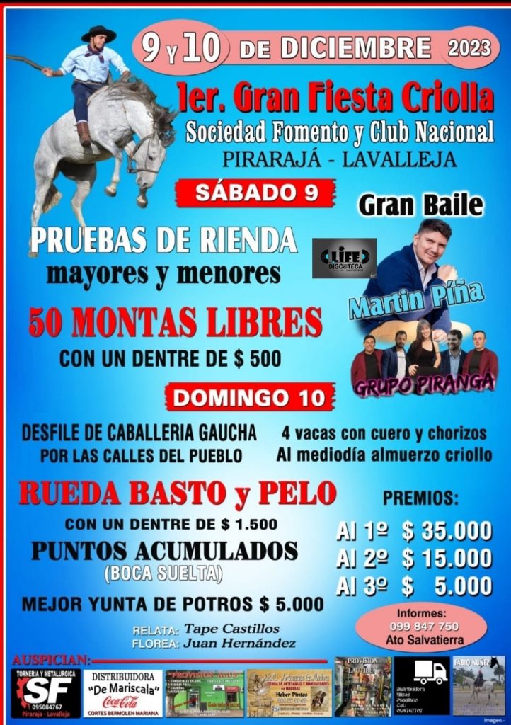 Este sábado, en el Club Nacional, se celebrará un baile con la música de Martin Piña y el Grupo Piranga. El domingo, habrá un desfile de la caballería gaucha por las calles del pueblo, junto con competencias de rueda de basto y pelo. Con premios para la mejor yunta de potros, con 5000 pesos para el primer puesto. Los premios mayores incluyen 35.000 pesos para el primer lugar, 15.000 pesos para el segundo y 5000 pesos para el tercero. Para más detalles, contactar al 099 847 750.